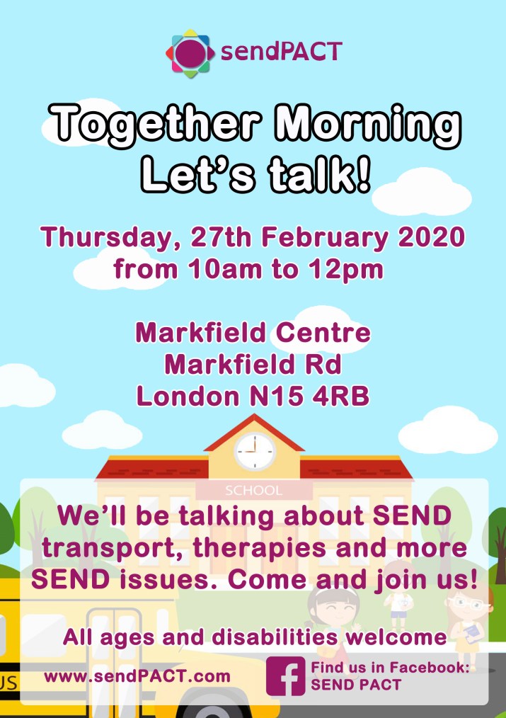 Together Morning is sendPACT’s regular meetup event, open to everyone. Much like coffee mornings, this is a time to meet parents/carers and get together for an informal chat. So, whether you’re a member of sendPACT or not, we hope you’ll come along.